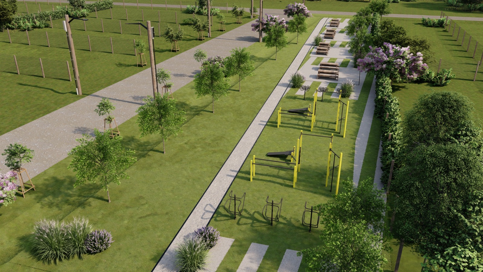 Parque lineal con cancha de fútbol, parrillas, juegos, gimnasio al aire libre y senda aeróbica.